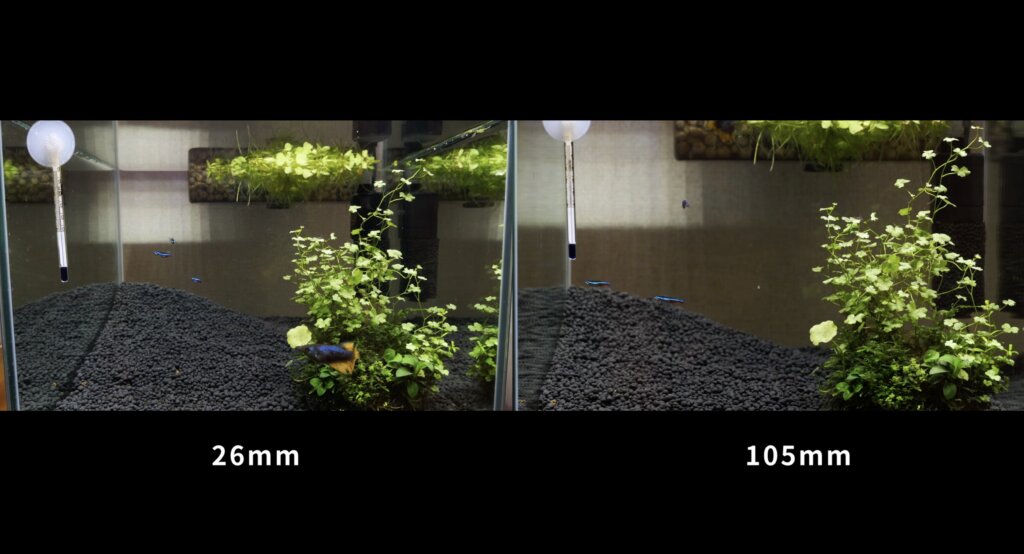 例として、スマホでよく使われる画角に近い26mmと、少し望遠寄りの105mmで撮影して比べると、背面ガラスの見え方がかなり変わります。