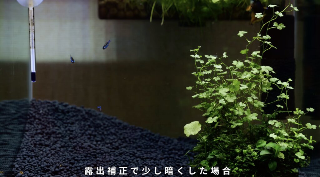水草に当たる光が強くて明るすぎると感じたら、露出補正を少し下げる。