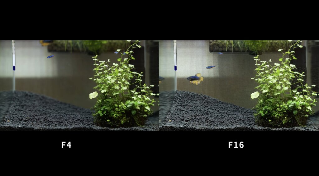 たとえばF4とF16を比べると、F16のほうが背景までピントが合いやすくなります。