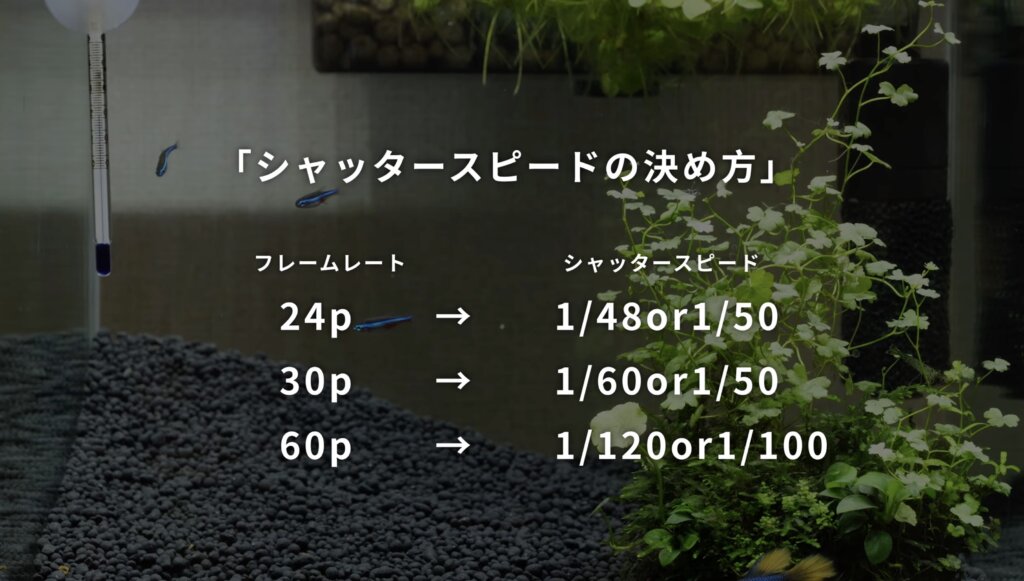 最後にシャッタースピード。動画の基本は「フレームレートの倍の1」目安です。