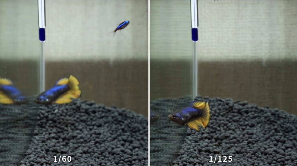 ただ魚は動きが速いので、もう少し止めたくなる場合もあります。試しに1/125秒くらいにすると、ヒレの動きが“ぶれているか/止まって見えるか”の違いが出ます。