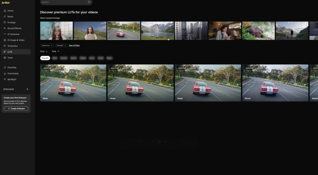 Artlistは楽曲や効果音の質と検索性に優れ、LUTやAI生成など周辺機能も豊富。