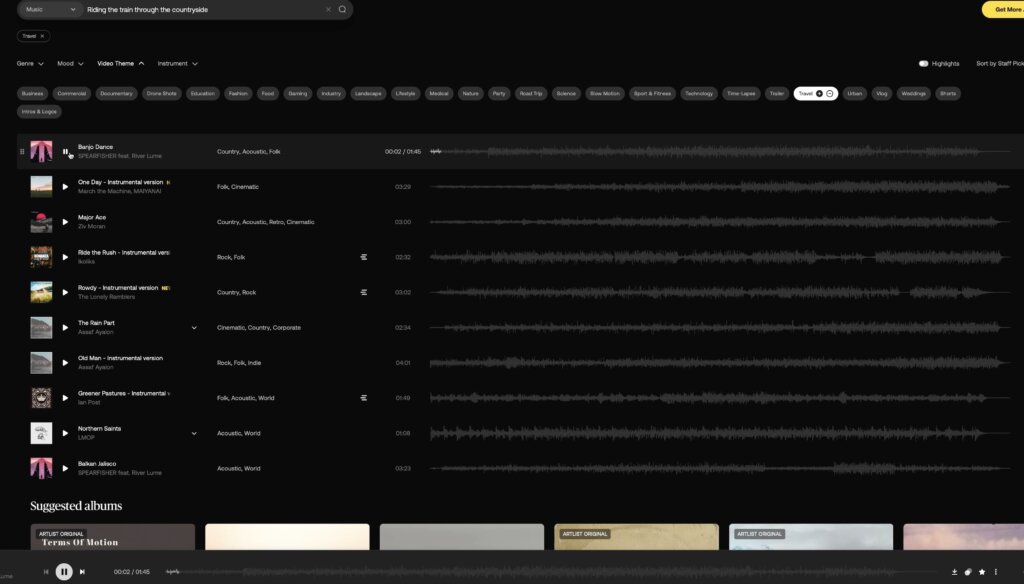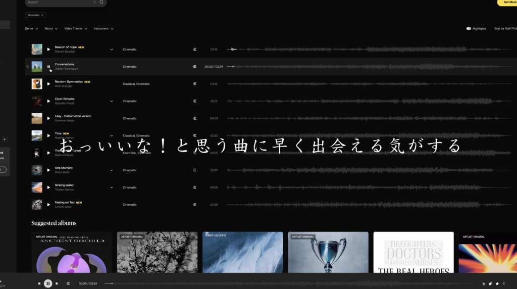 これまで他のサービスでは「これは使える!」と思える曲は20曲中1曲くらいの割合でしたが、Artlistでは7曲に1曲のペースでヒットする印象。