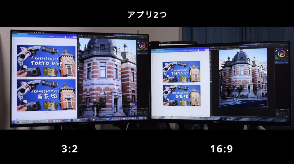 ソフトを2つ並べて表示した場合は、16:9モニターに比べてウインドウが縦長に感じます。