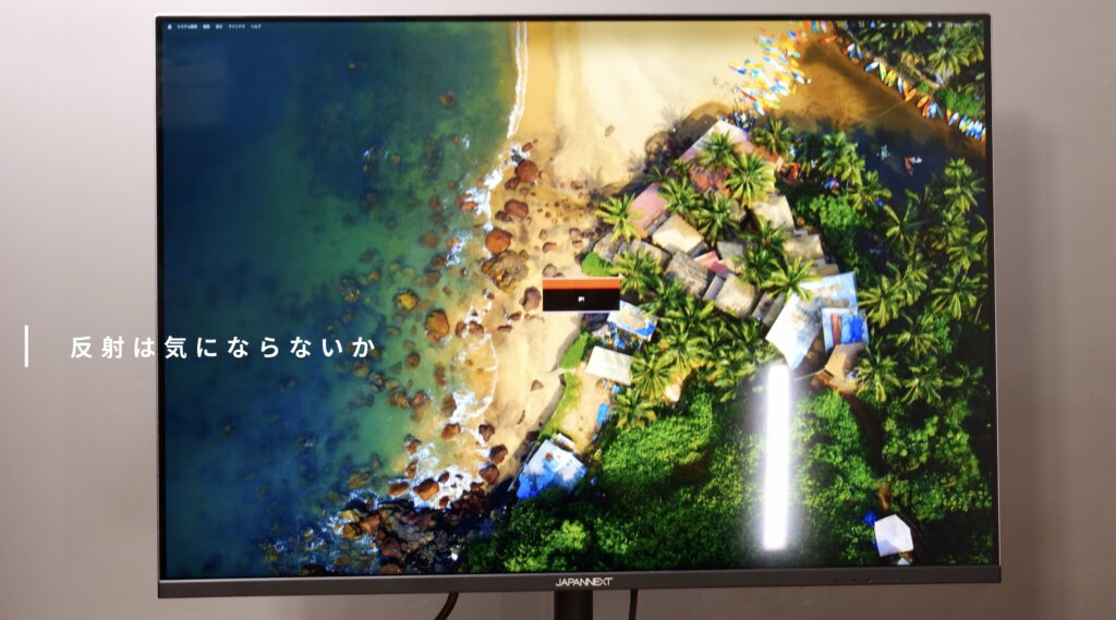 これは設置環境によって大きく変わる部分ですが、自分の環境では背景側に窓があるため、外の景色がしっかり映り込みました。