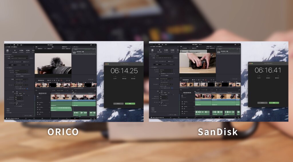 - 書き出し時間:SanDisk 約6分16秒 → ORICO 約6分14秒
