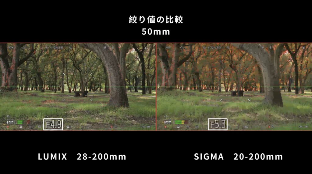 スペック通りとはいかず、実用ではLUMIXが明るく写るケースが多めでした。