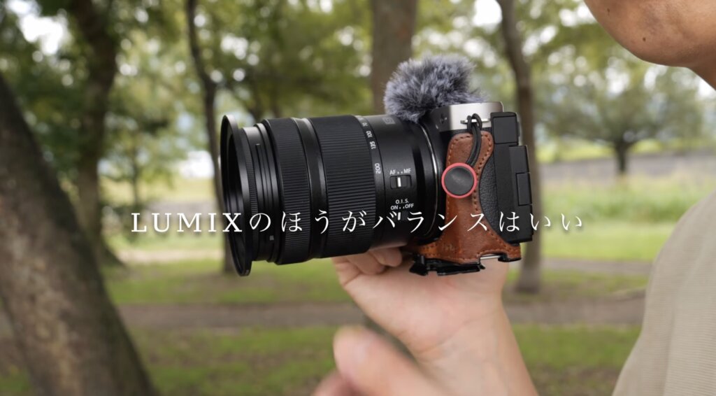 LUMIXはボディ側に重心が寄るため、取り回しが良好です。