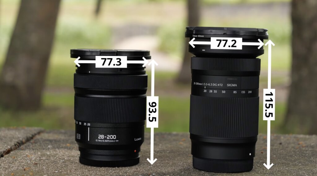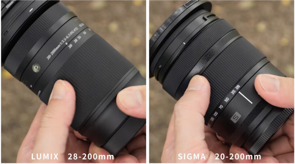 SIGMAは途中で細くなるデザインでスリムに見える一方、LUMIXは均一でコンパクトに見えます。