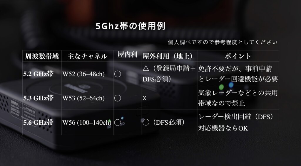 これにより高速で安定した通信が可能になりますが、日本国内では屋外使用に制限があります。